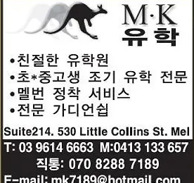 MK유학원 : 멜버른 현지 유학원 멜번에서 20년 이상을 살아오신 분으로서 줄곧 유학과 교육분야 일을 해 오셨습니다. 마운트웨이버리 한국어학교 교장선생님이시기도 합니다. 조영애 원장님께서는 (우리는 교장선생님이라고 부릅니다만...) 처음 유학오는 학생들을 위하여 학교 입학상담, 숙소 등을 어머니와 같은 마음으로 알아봐 주시고 계십니다. 따라서 멜번으로 처음 유학 온 학생에게 당황함 없이 학업에만 전념할 수 있도록 전폭적인 지원을 해 주시기로 유명하시지요. 또한 남편분께서는 여행가이드 일을 하고 계십니다. 그래서 "MK유학/여행"이란 회사명을 같이 사용하고 계신답니다. 멜번에 초기 정착, 조기유학, 단기가족 관광을 오시는 분들은 꼭 한번 연락주시길 바랍니다. MK유학원 : 멜버른 현지 유학원 MK여행사 : 멜버른 현지 여행사 Exchang.. 더보기 로즈버드에서 조개줍기, 해수욕 로즈버드 가는 방법 멜번시티에서 M3고속도로를 타고 남쪽으로 내려가서 Frankston Freeway를 갈아탄 다음 11번 도로를 타고 계속 가서 11번 도로의 끝에 가면 Jetty Road를 만나게 된다. 제티피에르( Jetty Pier ) 옛날에 고기잡이 어부들이 배를 댔던 부두였다고 하는데 지금도 고기잡이가 이 동네에 있는지는 모르겠다. 맑고 투명한 바다를 향해서 쭉 뻗어가 있는 Jetty Pier 를 걸어가면서 바라보는 바다는 지극히 아름답다. 거기에다가 부두가 낮고 바닷물이 투명하여 마치 바다 위를 걷고 있는 느낌이 날 정도이다. 몇몇 강태공들이 낚시를 던지고 있는 것이 보이지만 낚은 고기는 보이지 않았다. 해수욕장 이 해변의 특징은 한없이 걸어들어가도 무릎까지 밖에 차지 않는 얕고 넓다는 것이.. 더보기 이전 1 ··· 80 81 82 83 다음