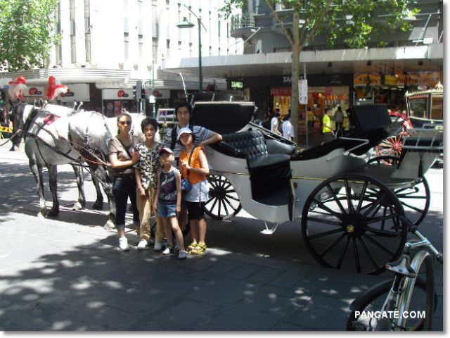 멜번 시티에 가면 길에서 마차가 많이 굴러 다닌다. 이 마차는 돈을 받고 관광용으로 태워주는 것으로 20분 정도 도는데는 60불, 1시간 정도 도는데는 100불 정도를 하는 거 같았다. 마차당 가격이기 때문에 한 번 빌릴 때 많은 사람이 타는 것이 유리하겠다. 끼어서 타면 8명은 탈 수 있을 크기이다. 끝에 2명이 돌아 앉을 수 있도록 간의 의자가 있다. 지붕이 있는 마차도 있고 없는 마차도 있으니 취향에 따라서 마차를 선택하면 된다. 우리 가족은 5명 이었는데 아들 녀석이 시티에서 마차 타보고 싶다고 오랫동안 소원해 왔었기 때문에 큰맘먹고 60불 주고 탔는데 한 20분 정도를 돌아다녀 주었다.
