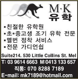 또한 남편분께서는 여행가이드 일을 하고 계십니다. 그래서 "MK유학/여행"이란 회사명을 같이 사용하고 계신답니다. 멜번에 초기 정착, 조기유학, 단기가족 관광을 오시는 분들은 꼭 한번 연락주시길 바랍니다.